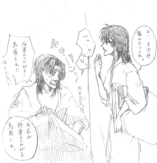 ・おそらく日替わりで、月曜日「伊作の薬が臭くて留三郎が眠れない」→火曜日「留三郎の寝像が鬼気せまり過ぎて伊作が眠れない」→水曜日「伊作の薬が臭くてry」→木曜日「食満ry」→金曜日「ふたりでイチャイチャしてて眠れない」・・・ってやってると思う。
